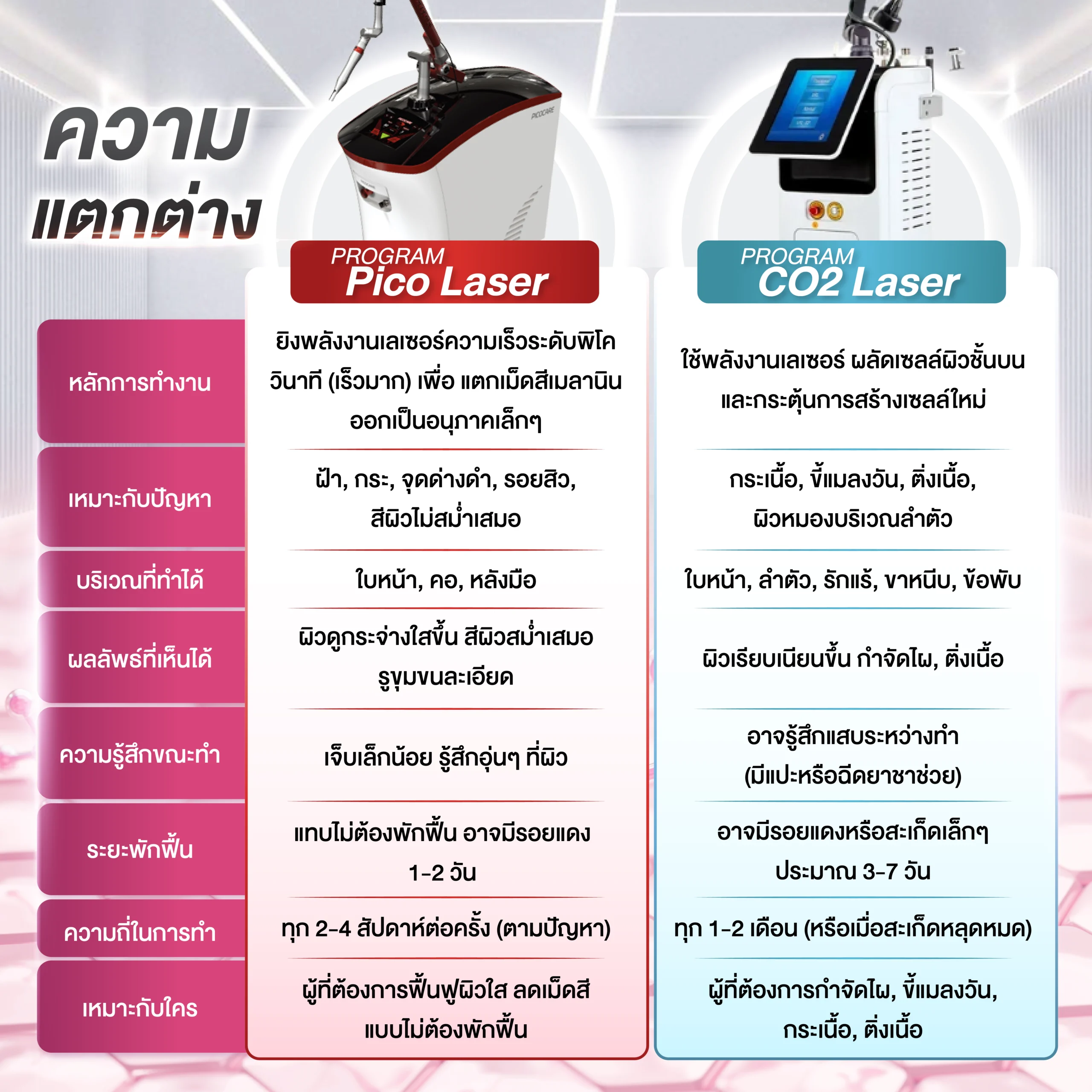 หรือ Picosecond Laser คือนวัตกรรมเลเซอร์ความงามที่ทันสมัยและเป็นที่นิยมอย่างมากในปัจจุบัน เลเซอร์ชนิดนี้ทำงานด้วยการปล่อยพลังงานแสงในระยะเวลาที่สั้นมากระดับ Picosecond (1 ในล้านล้านส่วนของวินาที) ทำให้เม็ดสีที่ผิดปกติในผิวหนังแตกตัวเป็นอนุภาคเล็ก ๆ คล้าย "ฝุ่น" ซึ่งร่างกายจะกำจัดออกไปได้ง่ายและมีประสิทธิภาพกว่าเลเซอร์รุ่นเก่าที่ใช้หน่วยเป็น Nanosecond (1 ในพันล้านส่วนของวินาที) ซึ่งเป็นกลไกที่เรียกว่า"Photoacoustic Effect" ต่างจากเลเซอร์รุ่นเก่าที่ใช้ความร้อนเป็นหลัก ทำให้ โปรแกรม Pico Laser ลดความเสี่ยงในการเกิดผลข้างเคียง เช่น ผิวไหม้ หรือรอยดำหลังการรักษา